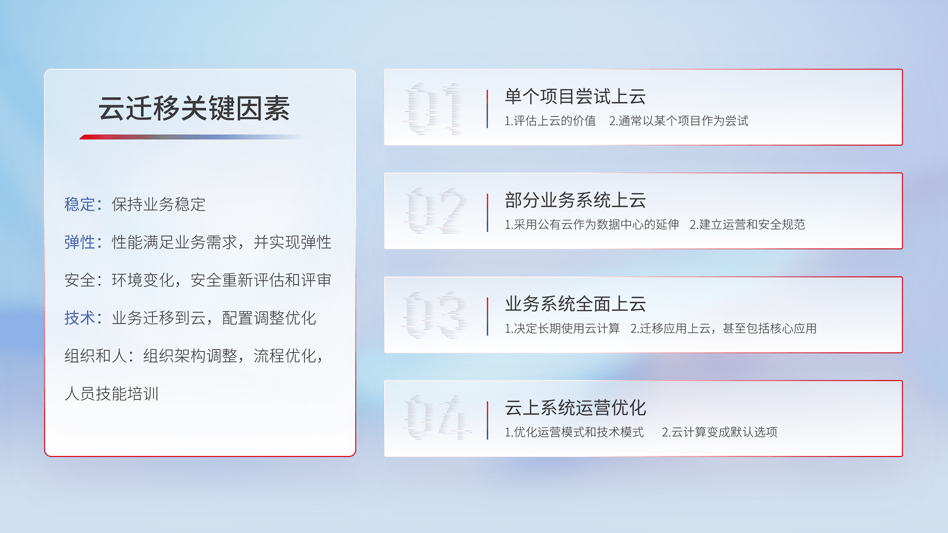 结合实际业务,,从规划设计、、、、云平台选型、、、云原生改造、、、数据迁移、、集成交付,,,,迁移全过程为客户识别最佳上云路径,,,,做好风险识别管理,,设计网络架构、、身份权限、、、、安全审计合规、、操作审计、、、日志审计、、、监控告警策略、、、多站点容灾设计等,,,,对云上基础设施进行整体规划,,提升IT治理水平,,,,以满足弹性、、高可用、、高性能的需求。。。